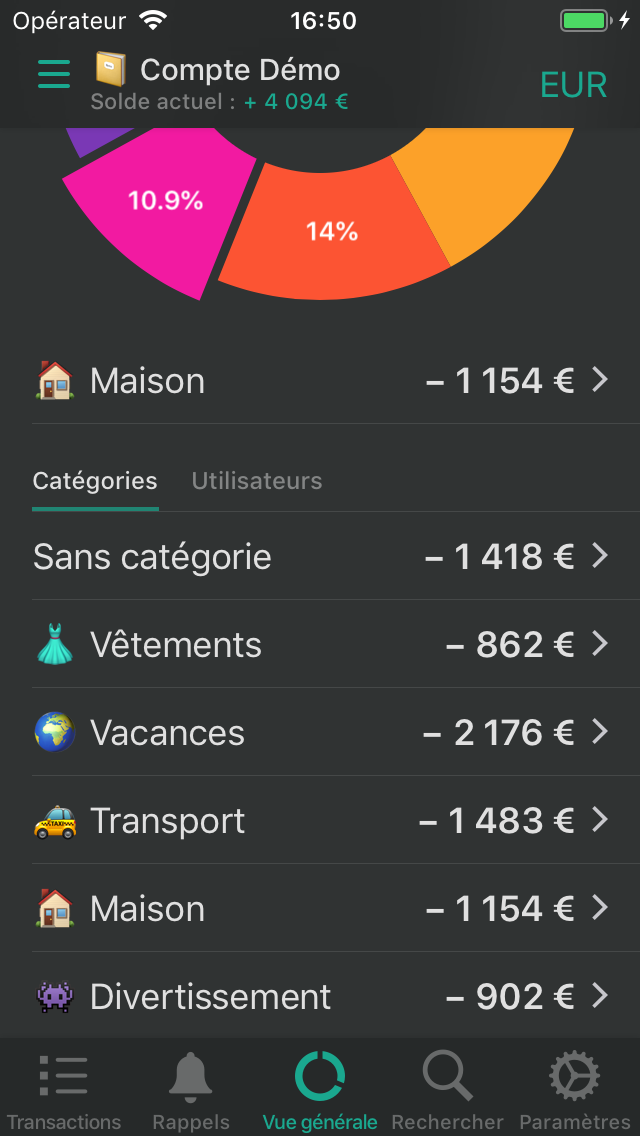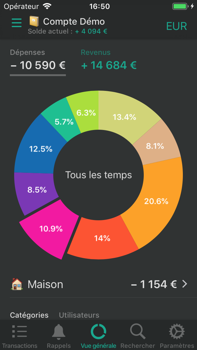 CashSync est un outil d comptabilité simple et pratique avec des comptes et devises multiples, une synchronisation cloud, de la comptabilité partagée, un système de rappels, des rapports interactifs, une calculatrice intégrée, et un convertisseur de devises.
